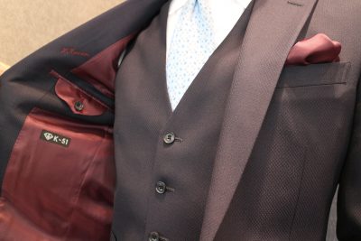 裏地がボルドーでも水色のネクタイが意外と合うんです!